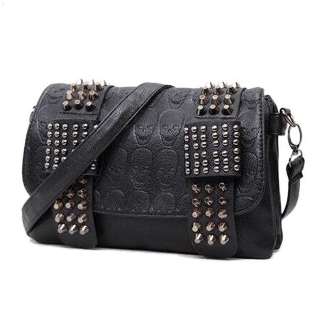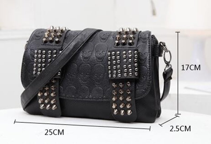 Fashion Women Black Leather Messenger Bags Fashion Vintage Messenger Cool Skull Rivets Shoulder Bags quantity